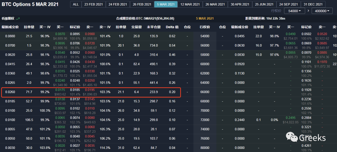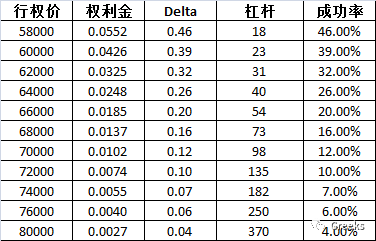 有一个不太严谨、但是很好用的方法,那就是把期权的Delta近似看作到期能够到达行权价实现的概率,或者说“成功率”。比如如图5中BTC-5MAR21-66000 Call的Delta是0.20,那近似地认为10天后到期时币价从当前55000多美元到达66000美元行权价的概率是20%。而这个期权的杠杆率为权利金0.0185或1.85%的倒数,也就是1/0.0185 = 54倍杠杆。杠杆率挺高,下跌不会爆仓,有20%的概率能够行权。