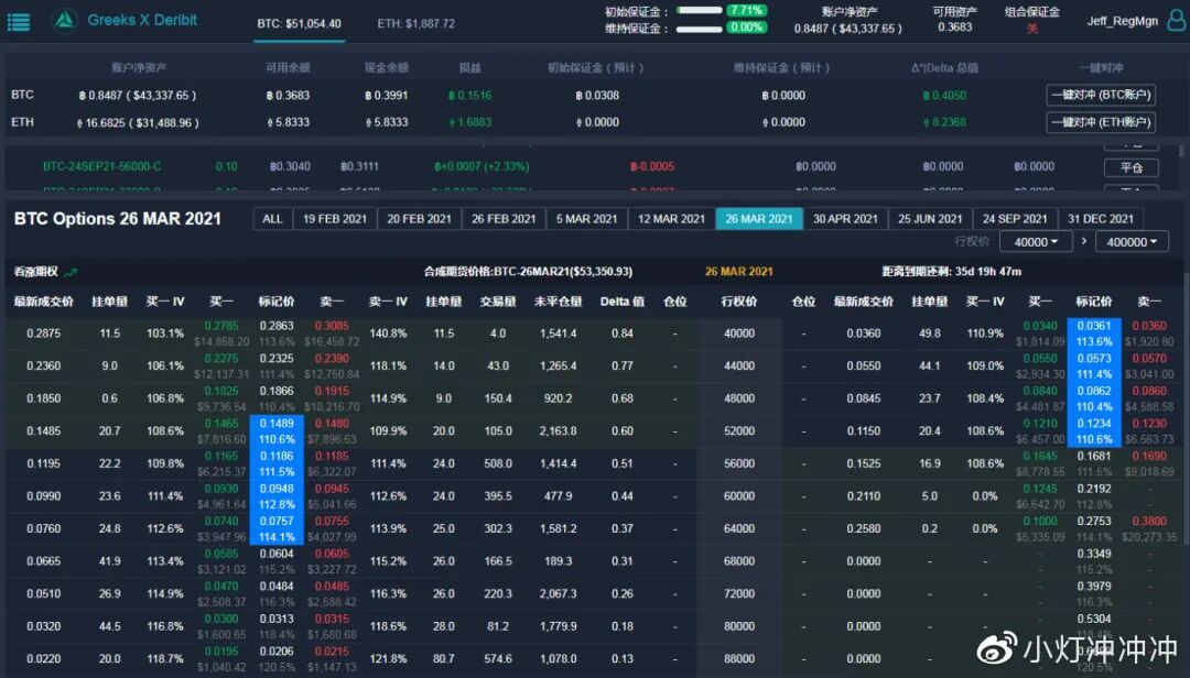期权报价表顶部的“合成期货价格”为53,350美元,Deribit的比特币期权是以期货价格作为计算期权在值程度的依据的。